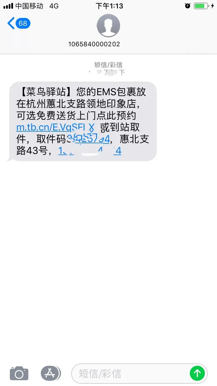 最近老是接收到电话,电话号是固定座机,接听后对方会说:您有一个菜鸟驿站包裹,请尽快来提取,然后我问:在哪里取?电话那头会说:您稍等为您转接人工.我原想着探索一下骗局的套路,然而还转来转去,没太多时间去等,于是我挂掉电话,然而紧接着收到短信。如下图。